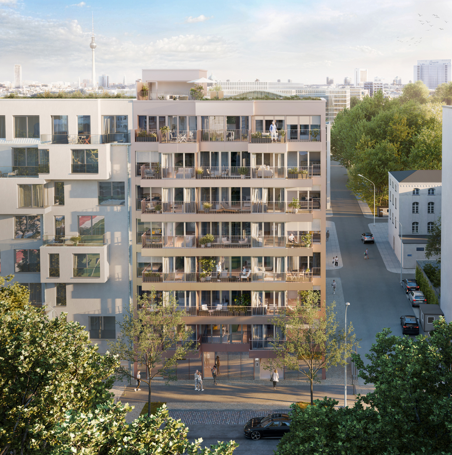 Mit seinem Champagnerton, den Spiegelflächen im Erdgeschoss und den feinen Alu-Details setzt „The Mind“ architektonisch ein glänzendes Statement in der Boyenstraße. Bei Sonnenschein reflektiert die Fassade das Licht, und bodentiefe Fenster sorgen für helle, einladende Räume – bis hin zu den spektakulären Penthouse-Wohnungen mit Weitblick über Berlin. Hochwertige Materialien und klare Linien bestimmen das Design. Im Inneren empfängt ein stilvoll gestalteter Eingangsbereich mit warmen Farben und einem durchdachten Lichtkonzept.